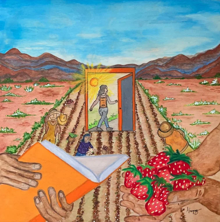 Adilene Vasquez Alvarez, North Monterey County High School student participated in the For The Love of Art, her submission, “Vencer El Sol” (Defeating the Sun) and was highlighted in the Monterey County Now Newsletter. In her piece, workers are picking strawberries at the foothills of the mountains, but then there is a door in the middle of the field, behind which a young girl with a backpack is walking into her bright future. Much closer, in the foreground, we can see hands offering strawberries in a celebratory gesture. “There is no correct way to do art,” says Vasquez Alvarez, whose parents moved to the U.S. from Mexico when they were teenagers. The landscape for “Vencer El Sol” was taken from her own summer experience of picking strawberries in Watsonville. It tells the story of “overcoming obstacles to follow my dream of battling a scorching sun that lies over my parents every day.”
